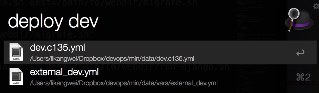 这样执行一条命令就可以完成整个代码部署了,在mac下,用Alfred编写一个workflow可以更方便的执行哦,按option+空格键,再输入deploy dev可快速实现执行部署命令: